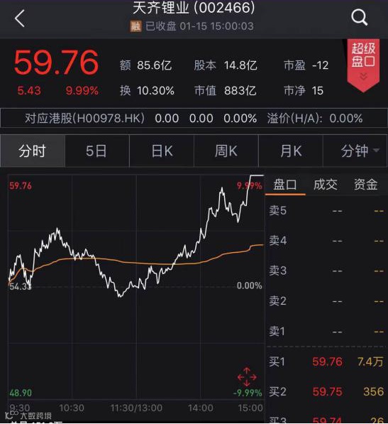 1月15日当天,天齐锂业股价高开高走,尾盘涨停,报收59.76元/股,当日成交额高达85.6亿元。