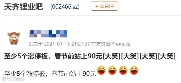 1月15日晚,天齐锂业发布159.26亿元的定增预案,公司控股股东天齐集团或其全资子公司将全额认购。股吧里一片欢呼,有投资者直言:“至少5个涨停板。”