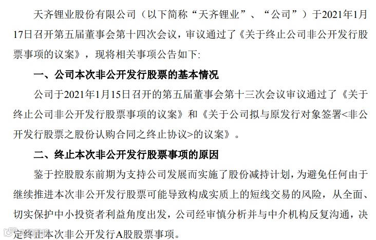 天齐锂业1月17日晚公告,当日公司召开董事会审议通过了《关于终止公司非公开发行股票事项的议案》。鉴于公司控股股东前期为支持公司发展而实施了股份减持计划,为避免任何由于继续推进本次非公开发行股票可能导致构成实质上的短线交易的风险,从全面、切实保护中小投资者利益角度出发,公司经审慎分析并与中介机构反复沟通,决定终止本次非公开发行A股股票事项。