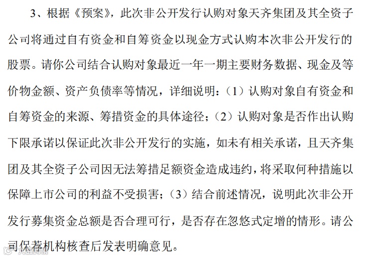 深交所还要求公司说明认购对象自有资金和自筹资金的来源、筹措资金的具体途径;认购对象是否作出认购下限承诺以保证此次非公开发行的实施,如未有相关承诺,且天齐集团及其全资子公司因无法筹措足额资金造成违约,将采取何种措施以保障上市公司的利益不受损害;结合前述情况,说明此次非公开发行募集资金总额是否合理可行,是否存在忽悠式定增的情形等。