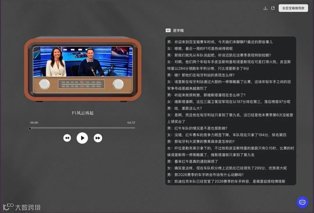 在内容质量方面,Tbox 播客小组表现出色。生成的 5 分钟音频涵盖了最近三场大奖赛的赛果分析、车手积分榜变化、技术规则争议等核心内容,信息完整度与专业体育媒体的简讯相当。值得称赞的是,系统还加入了 "专家点评" 环节,对 Verstappen 和 Hamilton 的战术选择进行了深入浅出的分析,显示出对专业领域知识的理解能力。