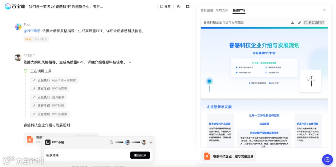 第四个测试场景瞄准商务办公需求,评估通用小组制作项目路演 PPT 的能力。在 AI 办公领域,PPT 生成是竞争最为激烈的赛道之一,GenSpark、天工 Agent、Minimax 等竞品均有出色表现,Tbox 的表现如何值得期待。