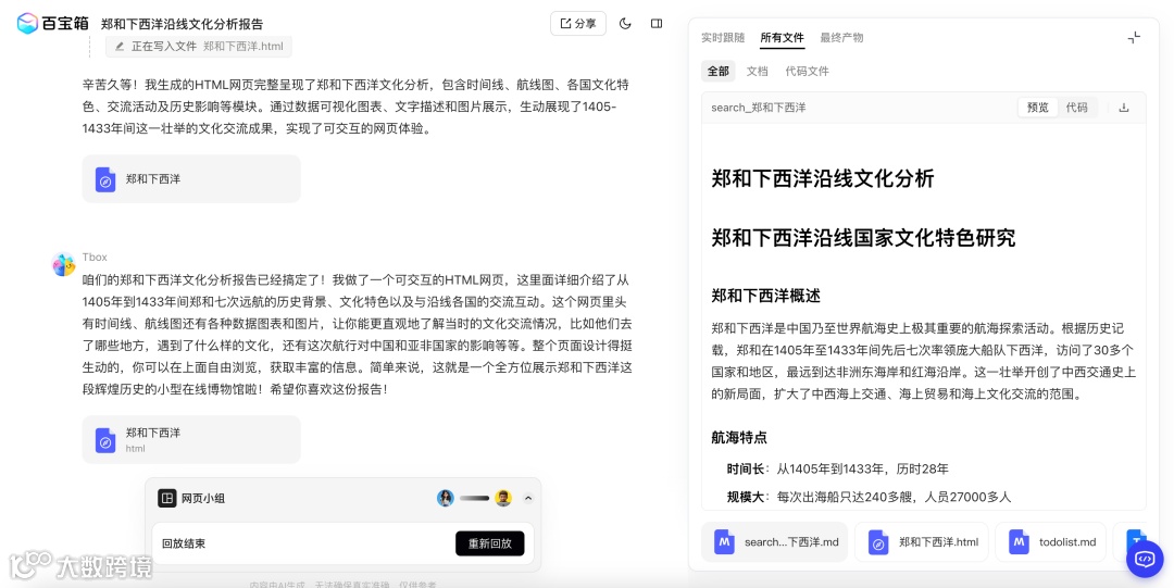 在第一个测试场景中,我们要求 Tbox 制作一份 "郑和下西洋沿线文化分析报告" 并生成展示网页。这一任务不仅需要处理历史地理知识,还涉及多语言文化比较和网页技术实现,非常适合检验多智能体协作能力。测试结果显示,Tbox 展现出了令人印象深刻的任务规划能力。