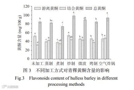 黄酮类化合物通常存在于粮食、果品、蔬菜中, 是评价食物健康功效的主要指标之一。由图 3 可知,不同加工方式所得青稞总黄酮含量之间存在差异。未经处理青稞的游离黄酮、结合黄酮和总黄酮含量依次为 52.39±2.43、32.23±1.48 和 84.61±3.87 mg/100 g。六种加工方式青稞的游离黄酮含量在38.12~53.57 mg/100 g 之间,结合黄酮含量在35.87~47.77 mg/100 g 之间,总黄酮含量在 73.99~98.99 mg/ 100 g 之间。除蒸制和空气炸锅外,青稞游离黄酮的含量均高于结合黄酮含量。与未加工相比,青稞加工处理后,结合黄酮的含量均有所提高,其中炒制青稞的结合黄酮和总黄酮含量显著增加了 38.10% 和 15.93%(P<0.05),游离黄酮含量无显著变化(P>0.05),这可能是由于黄酮在热处理中的变化主要取决于原料以及加工过程中相对温度高、时间短的热处理方式对青稞细胞的破坏越剧烈,更有利游离黄酮的保留与结合黄酮的释放。
