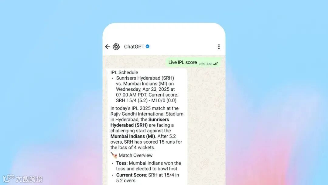 在跨平台交互扩展方面,ChatGPT首次实现了与WhatsApp的深度集成。用户只需向+1-800-242-8478发送消息,即可获取实时体育比分、新闻快讯等信息。例如发送“勇士队最新比分”,系统会立即返回比赛结果及技术统计,这种“短信式交互”使老年用户和非智能手机用户也能便捷使用AI服务。技术上,ChatGPT构建了一个“多模态交互引擎”,支持文本、语音、图片等多种输入方式,用户发送一张植物照片,系统会自动识别品种并提供养护建议,这种“视觉问答”能力拓展了AI的应用边界。此外,ChatGPT还推出了“离线模式”,在网络信号较弱的环境中,用户仍可使用基础问答功能,这种“鲁棒性设计”使AI服务更加普适。