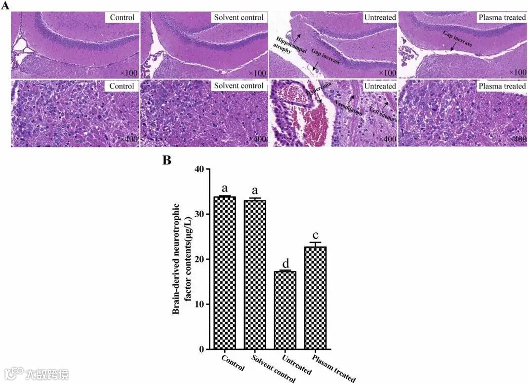 图6. (A)不同处理条件下小鼠海马组织和(B)脑源性神经营养因子含量的变化