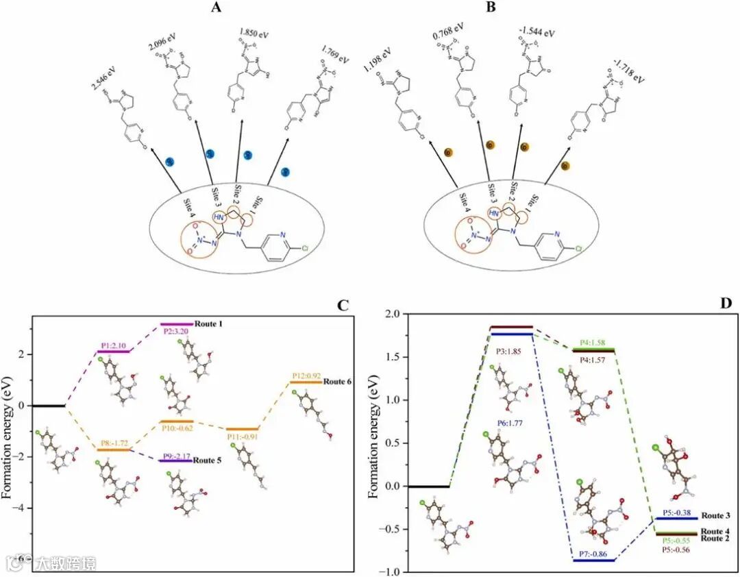 图4.(A)和(B): ROS攻击吡虫啉药效基团不同位点所需的形成能;(C)和(D): 冷等离子体系统中吡虫啉降解成不同中间体所需的形成能