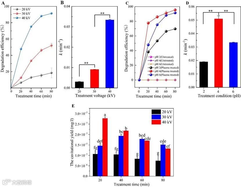 图1. 不同冷等离子体处理条件下吡虫啉降解效率和冷等离子体体系的空化产率(mg/J)