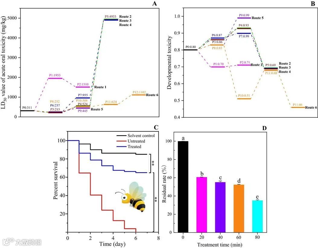 图5. 中间体(A)急性经口毒性和(B)发育毒性预测。(C)使用/不使用等离子体处理的吡虫啉溶液对蜜蜂的存活率的影响以及(D)冷等离子体对雄性蜂蛹中吡虫啉的降解能力