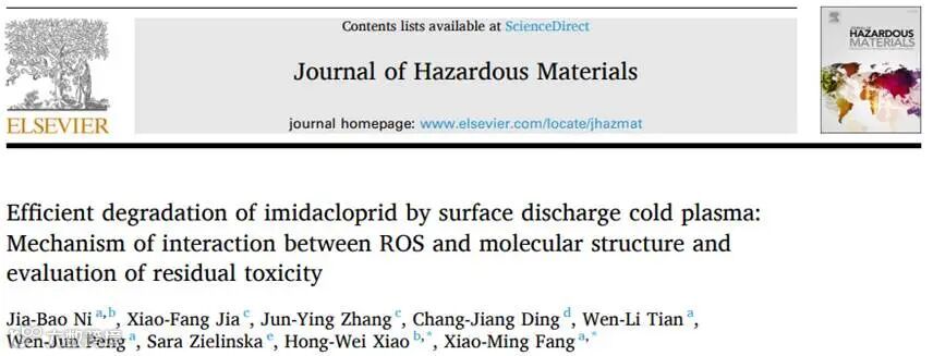 ●2023年11月,中国农业大学肖红伟教授、中国农业科学院蜜蜂研究所方小明研究员在中科院一区TOP期刊Journal of Hazardous Materials(IF=13.6)上发表题为 " Efficient degradation of imidacloprid by surface discharge cold plasma: Mechanism of interaction between ROS and molecular structure and evaluation of residual toxicity "的研究型论文。
