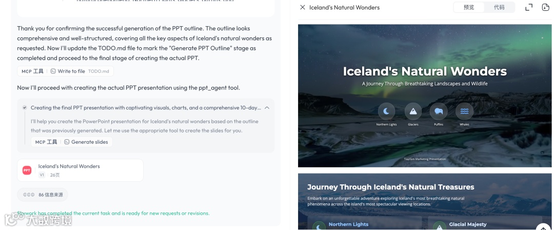 这种能力的背后,是天工在技术架构上的突破。其“5专家+1通用”智能体架构,将文档、PPT、表格、网页、播客等模态拆解为垂直领域的专家系统。以PPT智能体为例,它能在深度搜索后生成包含双语叙事、动态效果的专业演示文稿,所有数据均可溯源。这种模块化设计,既保证了专业场景的内容质量,又通过通用智能体接入数十个MCP工具,实现从文字到音视频的全链路创作。