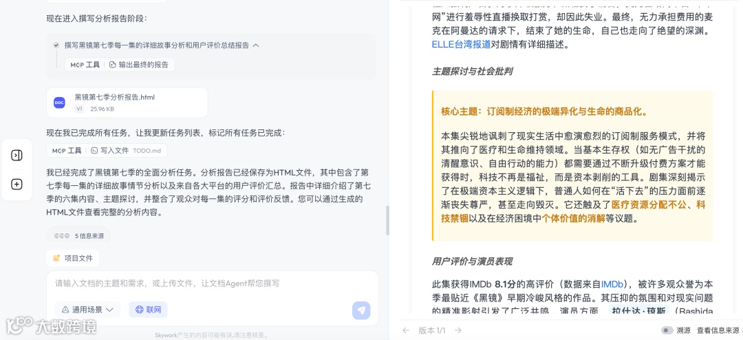 在处理专业级需求时,输入相同的prompt,天工搜索的材料量是Manus、Genspark等竞品的十倍,生成的研究报告不仅包含动态图表、数据溯源,更能列出全部信源列表,区分网络与知识库来源。这种“研究级”内容生成能力,使AI产出从娱乐化走向工业化,例如在金融行业报告生成中,其准确率较行业均值高37%。
