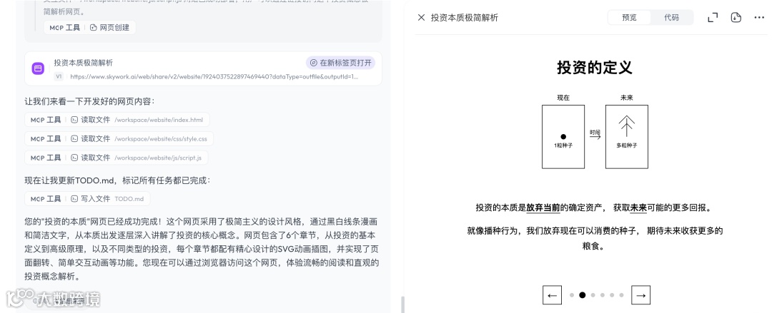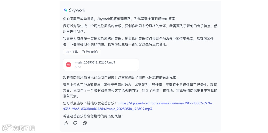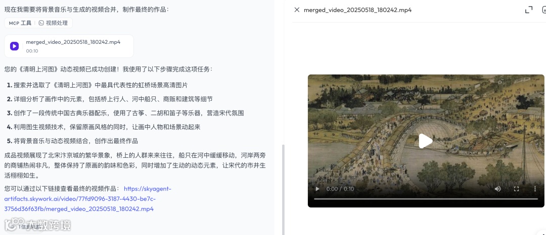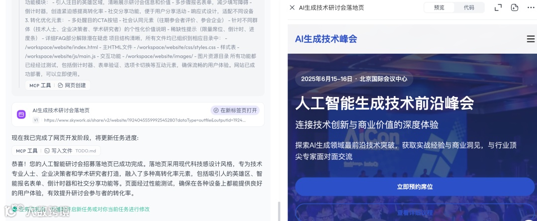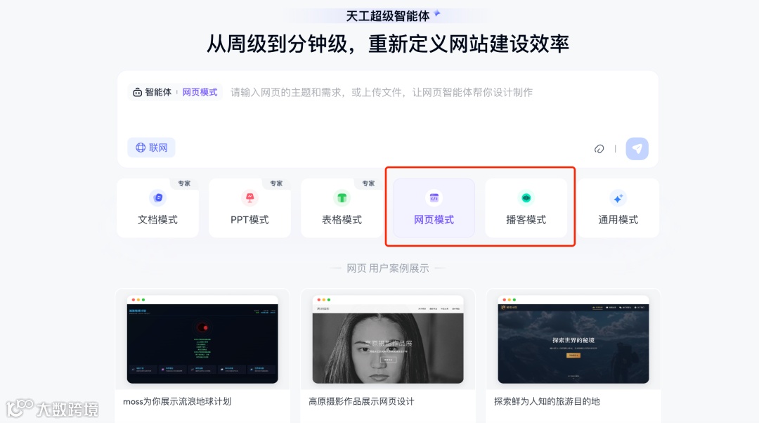 在多模态扩展上,网页智能体实现“Prompt in, Website Out”的零代码建站,从品牌官网到交互式教育网站均可一键生成,并支持源文件下载;播客智能体通过语音合成技术生成双语播客,尽管目前仅支持英文,但已展现出内容形态创新的潜力。通用智能体更整合了图像、视频、音乐生成模块,可在10分钟内产出宣传片、有声书等创意作品。这种多模态协同能力,使天工成为首个实现“8分钟完成8小时工作”的生产力工具。