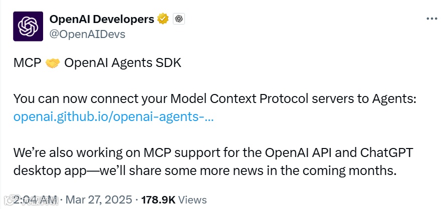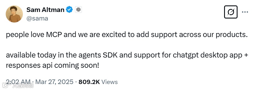 奥特曼在声明中表示:“人们非常喜欢MCP,我们也很高兴在我们的产品中增加对它的支持。今天我们已经在Agent SDK中支持MCP,对ChatGPT桌面应用以及Responses API的支持也即将到来!”这一表态不仅展现了OpenAI对MCP价值的认可,更暗示着未来AI智能体(Agents)的开发成本将大幅降低。通过MCP,开发者能够以统一的接口标准为智能体无缝接入各类第三方工具,从而在复杂自动化应用的开发中显著提升效率。