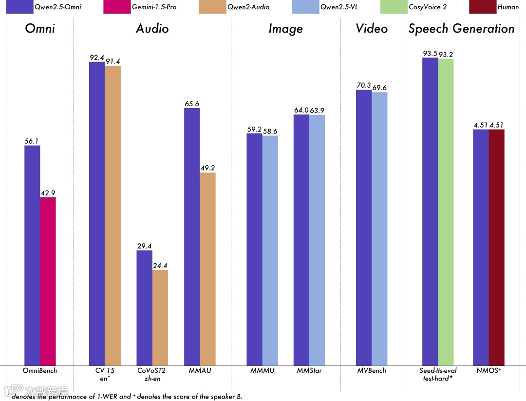 在性能维度上,Qwen2.5-Omni树立了多模态AI的新标杆。在与同等规模单模态模型的对比测试中,它在图像推理、音频理解、视频分析等全模态任务中均表现优异。例如,其音频处理能力较同系列的Qwen2-Audio提升了30%,图像理解水平与Qwen2.5-VL-7B不相上下。在权威的多模态融合任务评测平台OmniBench中,Qwen2.5-Omni更是以总分92.3分的成绩位列行业榜首,这一成绩不仅超越了同期发布的其他多模态模型,更较上一代Qwen系列模型提升了15个百分点。此外,在单模态任务中,Qwen2.5-Omni同样表现出色:在语音识别任务(Common Voice)中,其准确率达到98.7%,创下该数据集的新纪录;在翻译任务(CoVoST2)中,BLEU得分提升至68.5,大幅领先于同类模型;在音频理解任务(MMAU)中,其分类准确率达到94.2%,展现了跨模态处理的强大泛化能力。