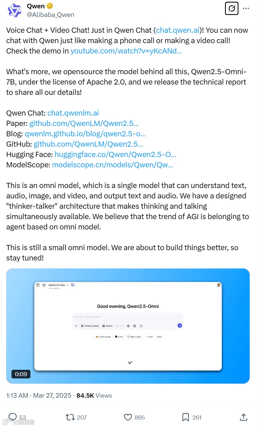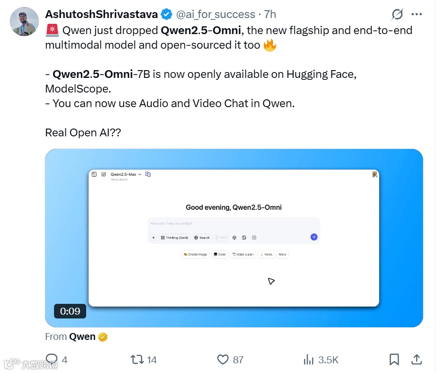 正如人工智能领域专家李飞飞所言:“Qwen2.5-Omni的开源不仅是技术的共享,更是创新生态的构建。”通过官方提供的体验地址(https://chat.qwen.ai/),用户可以直观感受到这款全模态模型的强大能力。无论是通过语音指令让AI分析一段视频的内容,还是通过文字与图像的混合输入让AI生成创意文案,Qwen2.5-Omni都能以超越传统模型的效率和精度完成任务。这种直观的体验让更多人看到了多模态AI的潜力,也加速了人工智能在各个领域的应用落地。