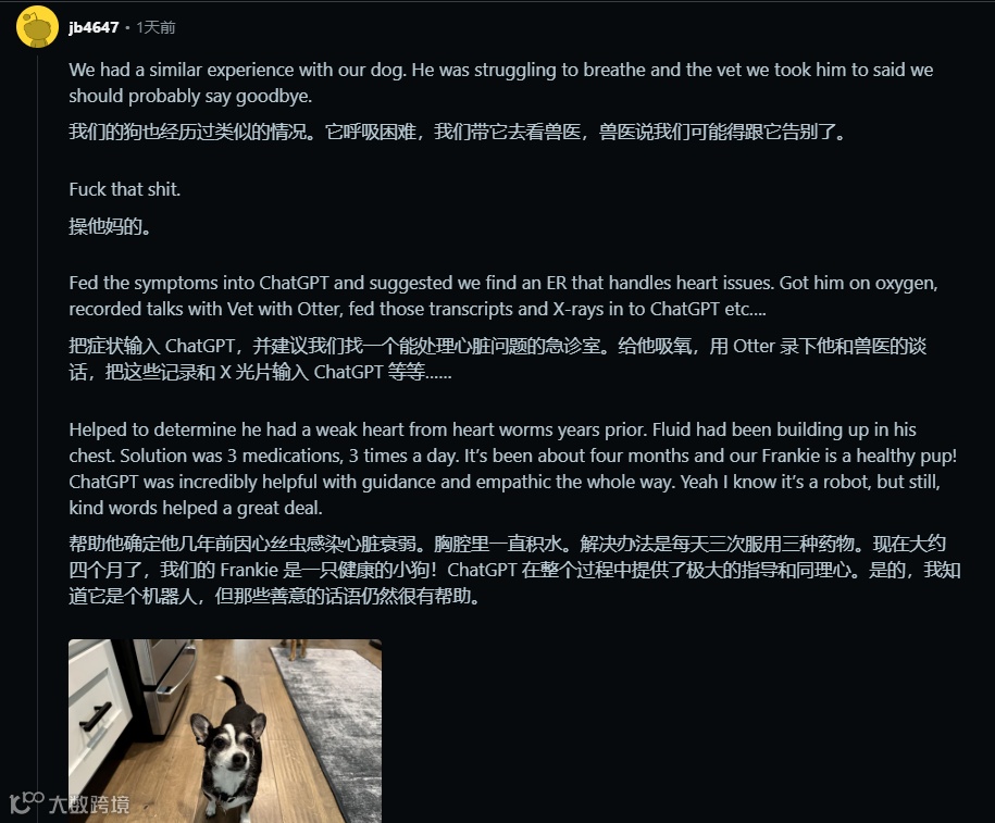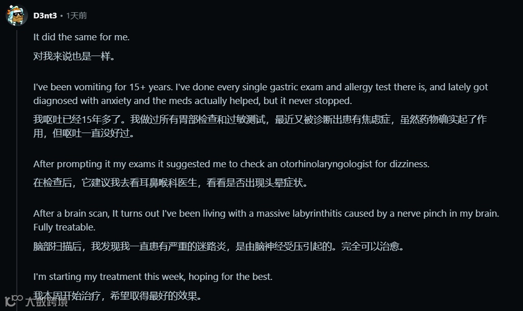 类似的故事在社交媒体上不断涌现,勾勒出 AI 在医疗领域破局的清晰轨迹。一位呕吐超过 15 年的网友历经胃部检查、过敏测试并被诊断为焦虑症,药物控制下呕吐未缓解,在 ChatGPT 建议下因头晕症状就诊耳鼻喉科,最终找到病症根源看到治愈希望;更有宠物主人在兽医束手无策建议 “告别” 时,因 AI 提示转至心脏急诊室挽救了爱犬生命。这些案例看似离奇,却共同指向一个趋势:当传统医疗体系在病因复杂、跨学科关联的疑难病症面前遭遇瓶颈时,AI 正凭借其独特的数据处理能力成为破解医学谜题的关键力量。