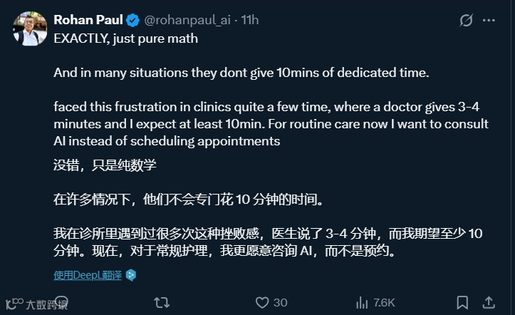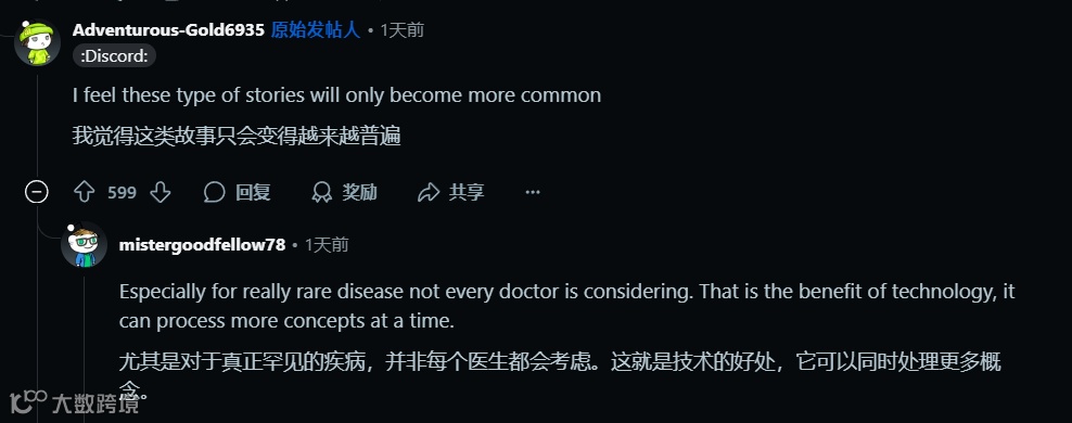 回到 Reddit 网友的案例,其启示意义远超个案本身:它揭示了在数据爆炸时代,医疗诊断正从经验驱动转向数据驱动,从单一学科诊疗转向多维度整合。当 AI 将散落的医学证据编织成网,当医生在这张网络中寻找属于每个患者的独特节点,传统医疗的边界正在被重新定义。然而无论技术如何进步,医疗的本质始终是人与人的连接 ——AI 可以处理数据,却无法替代医生触诊时的温度;可以生成报告,却无法理解患者眼神中的焦虑。理想的医疗图景,应是 AI 作为高效的信息处理器,将医生从繁琐的资料检索中解放出来,使其有更多精力专注于医患沟通与临床思辨,让技术的进步最终服务于人性的温度。