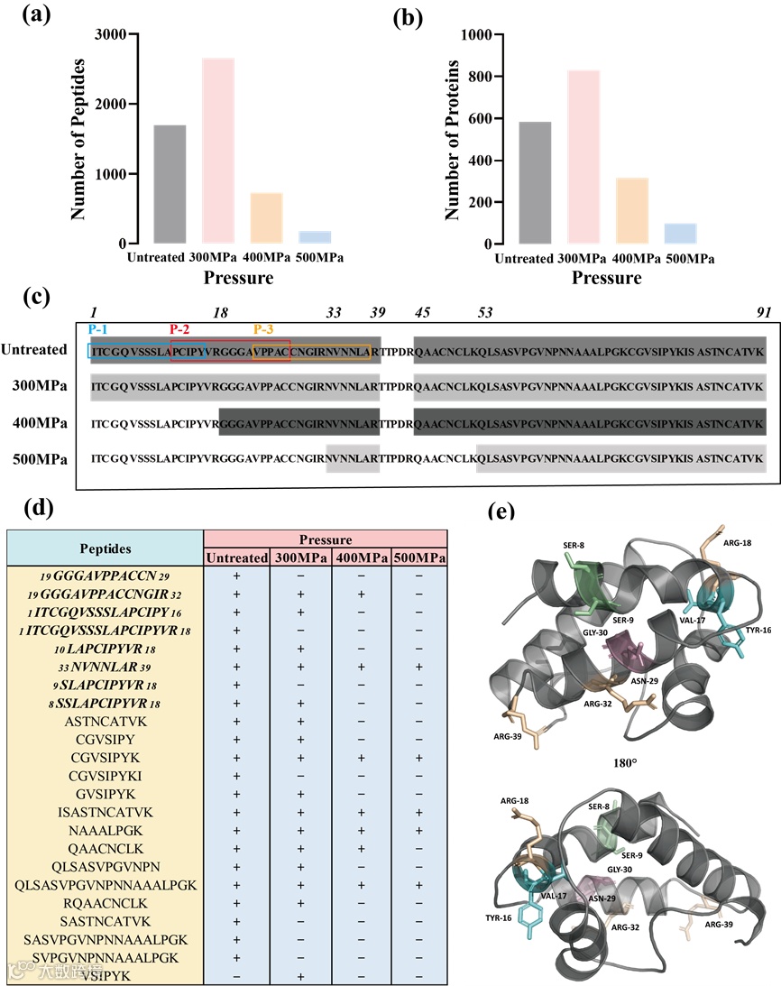 利用Proteinpilot软件对图谱数据进行分析,如图5a和图5b所示,ProteinPilot鉴定得到的桃蛋白酶切产物中的蛋白质和肽的数量在超高压处理后呈现先增加后减少的趋势,这可能是由于超高压处理引起桃蛋白结构的改变,从而影响了酶切效率。单独提取了Pru p 3的肽段数据发现,当压力为300 MPa时,检测到的肽段几乎覆盖了Pru p 3氨基酸的整个序列,这与未经超高压处理的样品结果一致。而在400 MPa时,检测到的肽的数量减少,在500 MPa时达到最低(图5c)。将检测到的肽段绘制成表格,并筛选出含有Pru p 3表位的肽进行分析(图5d)。在较低的压力下(≤400Mpa),一些表位肽没有被检测到,可能是由于超高压处理减少了这些肽段非特异性断裂的发生。例如,肽段19GGGAVPPACCN29和肽段19GGGAVPPACCNGIR32在未处理组都被检测到,而肽19GGGAVPPACCN29在超高压处理组(≤400Mpa)没有被检测到,这可能是由于天冬酰胺-29和甘氨酸-30之间没有发生非特异性断裂。然而,超高压处理也可能会加剧一些肽段的非特异性断裂。例如,肽段1ITCGQVSSSLAPCIPYVR18在未处理组中被检测到,而在超高压处理组(≤300MPa)中没有发现,而它的一些片段(1ITCGQVSSSLAPCIPY16、10LAPCIPYVR18和8SSLAPCIPYVR18)在超高压处理组被检测到。这可能是由于丝氨酸-7、丝氨酸-8、丝氨酸-9、亮氨酸-10、酪氨酸-16和缬氨酸-17之间的非特异性断裂增加,导致长肽1ITCGQVSSSLAPCIPYVR18完全断裂。当压力增加到500 MPa时,大量的肽段没有被检测到,可能是由于过高的压力改变了蛋白质的结构,使得大量的酶切位点被掩蔽,导致蛋白难以被酶切。主要被掩盖的酶切位点包括精氨酸-18和精氨酸-32。然而,在未处理组和超高压处理组都检测到肽33NVNNLAR39,这表明精氨酸-39附近区域的结构变化不明显,酶切正常进行。表位肽的变化主要集中在Pru p 3的前两个α-螺旋上。有非特异性断裂变化的位点和受影响的酶切位点也都位于这两个α-螺旋中。受影响较小的酶切位点(精氨酸-39)位于二级结构的无规则卷曲中,这也与之前的结果一致,即超高压处理对二级结构中的α-螺旋有明显影响,但对无规则卷曲无明显影响(图5e)。