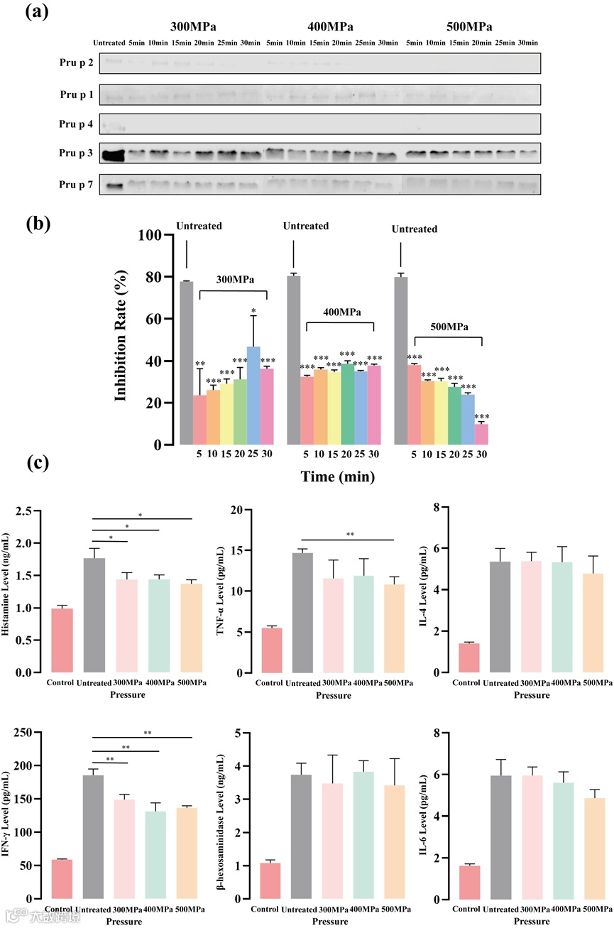 通过western-blot来评估超高压处理对桃过敏原蛋白IgE结合能力的影响(图4a),在未处理的桃蛋白中,除Pru p 4以外,其余四种过敏原蛋白产生了灰度值不同的阳性条带,其中Pru p 3的条带灰度值最深,这表明Pru p 3可能具有最强的IgE结合能力,在超高压处理的桃蛋白中,western-blot检测到的阳性条带数量减少,灰度值也逐渐降低。其中表现最明显的是Pru p 2,当加压到500 MPa时,几乎没有明显的阳性条带出现。相反,Pru p 1的IgE结合能力对超高压处理并不敏感,阳性条带的数量和灰度值并没有随着压力和时间的增加而明显减少。此外,竞争抑制性ELISA实验来分析超高压处理对桃蛋白总IgE结合能力的影响(图4b)。结果表明,经过超高压处理的桃蛋白的IgE结合能力逐渐下降,并在500 MPa加压30 min时表现最为明显。这可能是由于桃蛋白的空间构象在超高压处理过程中发生了改变,导致抗原结合表位的破坏或掩蔽造成的。超高压处理会下调KU812脱颗粒后组胺,TNF-α及IFN-γ的释放水平,前二者有助于致敏性削减,后者不利于致敏性削减。而IL-4,IL-6表现出下调趋势,但这种趋势并不明显(图4c)。