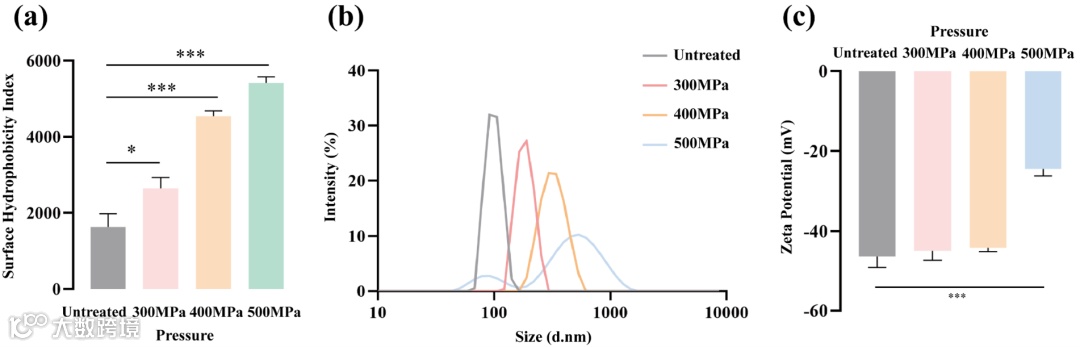 未经超高压处理的桃蛋白的大部分疏水基团被埋在蛋白质分子内部,随着压力的增加,一些蛋白质构象变得松散,更多的疏水基团被暴露出来,从而增加了蛋白质的疏水性。疏水性的增加不利于蛋白质的溶解(图3a),桃蛋白粒径主要分布在100 nm左右,随着压力梯度的增加(≤400 MPa),蛋白质粒径增大,表明在这个压力范围内可能产生了大分子量的聚合物。当压力达到500 MPa时,一些桃蛋白被降解,产生了分子量较小的碎片。可以看出,一定程度的超高压处理可以使桃蛋白聚合,而过高的压力则可能导致桃蛋白的降解(图3b)。经过超高压处理后,桃蛋白的zeta电位绝对值趋近于0,说明蛋白分散体系的稳定性变差,蛋白有聚合的趋势。这与超高压处理后桃蛋白产生了粒径较大的聚合物结果一致,也解释了超高压处理后桃可溶性蛋白含量下降的原因(图3c)。