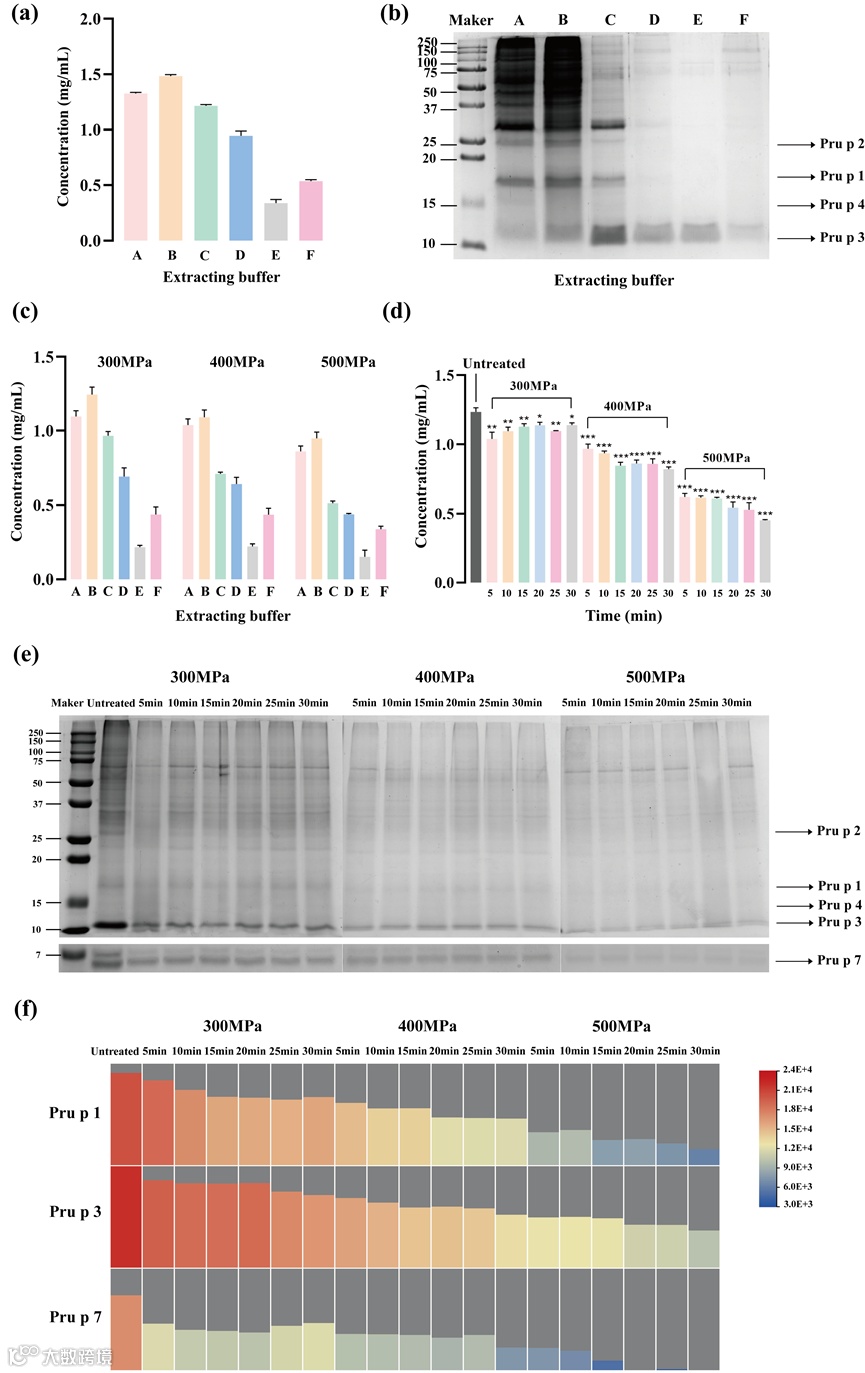 对于鲜桃和超高压处理后的桃,使用尿素+CHAPS提取的桃可溶性蛋白质含量最高(图1a,图1c)。SDS-PAGE结果表明,使用尿素+CHAPS提取的桃蛋白条带显示出较深的灰度值(图1b)。随着压力的增加和时间的延长,桃可溶性蛋白含量明显下降(图1d,图1e)。这可能是由于超高压处理破坏了蛋白质的疏水性和静电相互作用,从而影响了蛋白质的水合特性。过大的压力可能使蛋白结构变得松散,暴露出更多的疏水基团,形成不溶性聚合物,从而降低蛋白浓。用LC-MS/MS对桃的三种主要过敏蛋白(Pru p 1、Pru p 3和Pru p 7)进行相对定量(图1f),结果显示,这些蛋白的含量在超高压处理下都出现了不同程度的下降。其中,Pru p 3的含量下降较慢,这可能是由于Pru p 3中存在四个稳定的二硫键,导致Pru p 3结构对超高压处理具有一定抗性造成的。