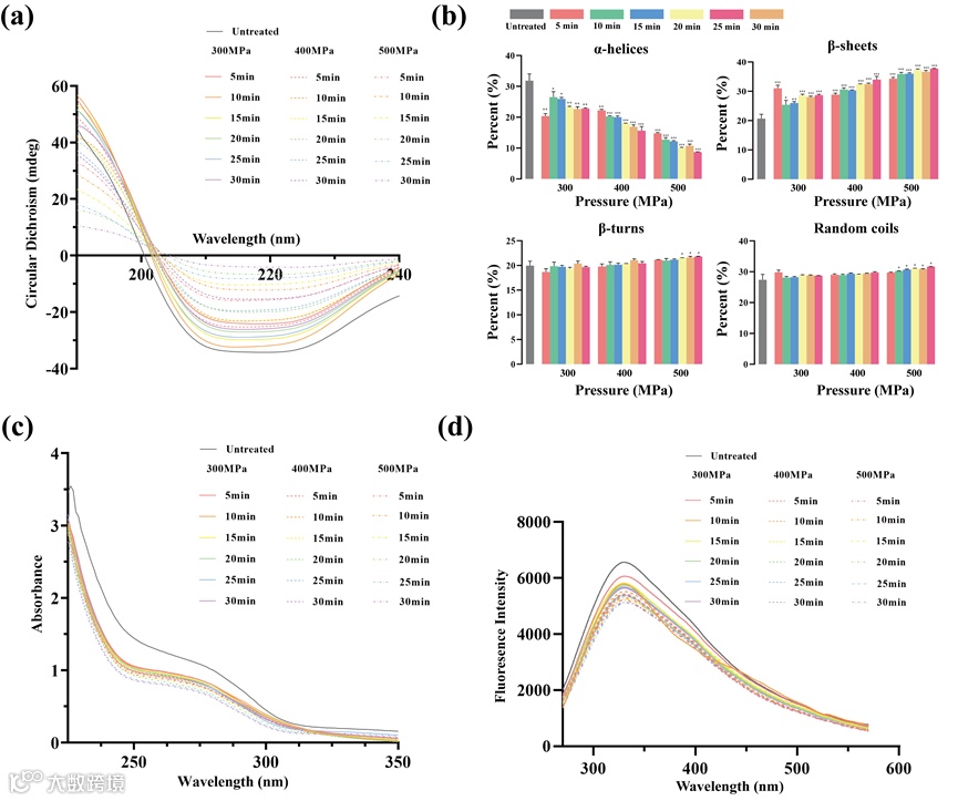 通过CD光谱分析超高压处理对桃蛋白二级结构的影响(图2a,图2b),结果表明,随着力的增加和时间的延长,桃蛋白二级结构中α-螺旋的含量逐渐减少,β-折叠的含量明显增加,而β-转角和无规则卷曲的含量没有明显变化。这可能是由于超高压处理破坏了维持α-螺旋结构的氢键和静电相互作用,导致部分α-螺旋转化为β-折叠,蛋白质结构变得更加松散导致的。紫外光谱显示,经超高压处理的桃蛋白在280nm处的吸收峰逐渐下降(图2c),这可能是由于三级结构的重新排列,导致更多的芳香族残基被掩盖而引起的。此外,超高压处理引起的氨基酸残基中共轭双键的破坏也可能是一个原因。内源性荧光光谱显示335 nm处的吸收峰逐渐减少,这可能是由于色氨酸残基附近微环境的变化,导致更多的色氨酸掩蔽引起的(图2d)。