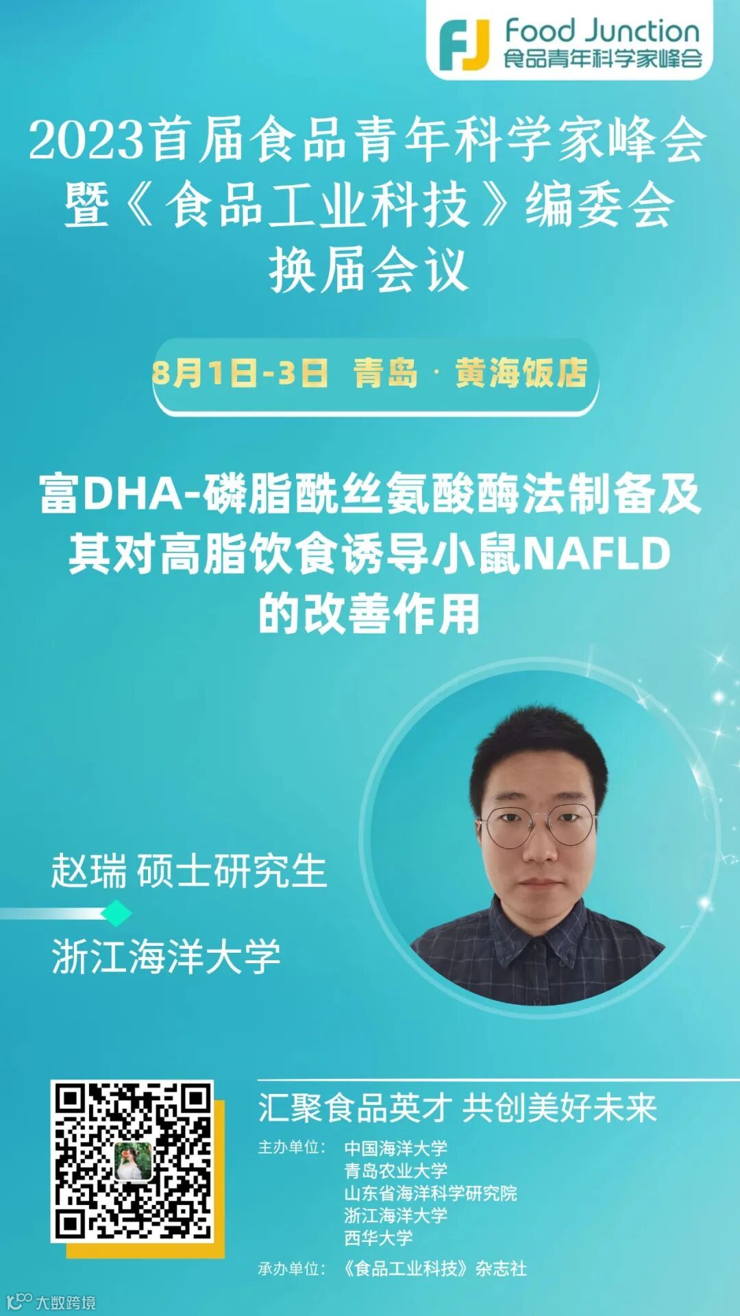 赵瑞,男,就读于浙江海洋大学食品与药学学院,所属浙江省海洋生物医用制品工程技术研究中心团队,药学专业2021级硕士研究生。研究生期间主要研究内容为海洋药物与生物制品,参与了浙江省基础公益研究计划等科研项目并且发表SCI论文3篇。本次参会欲报告《富DHA-磷脂酰丝氨酸酶法制备及其对高脂饮食诱导小鼠NAFLD的改善作用》,以求与各位优秀科研人员进行深入的交流与学习。