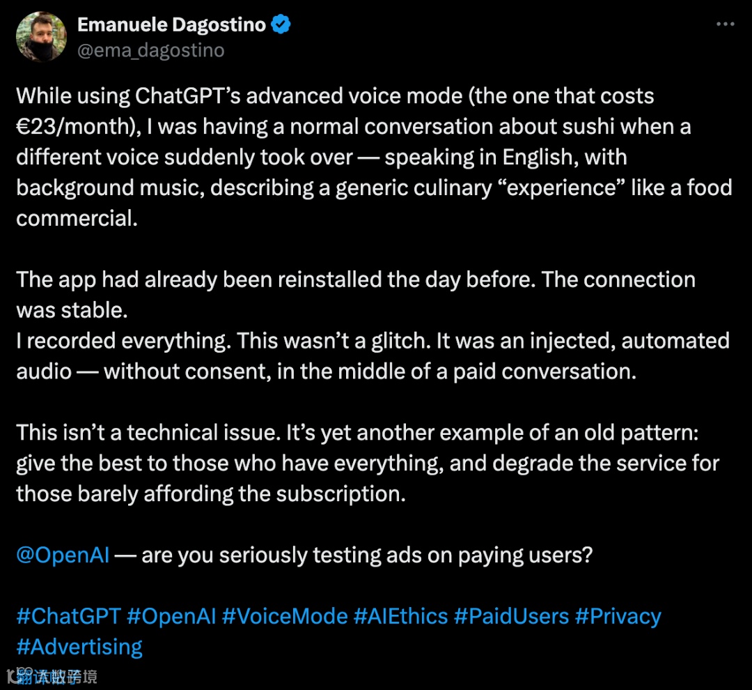 这种异常现象迅速在社交媒体发酵。有用户指出,每月支付23欧元的会员服务中遭遇广告植入,质疑OpenAI将付费用户作为广告测试对象。更有用户将问题上升到阶层矛盾,认为这是“将优质服务留给富人,向普通用户推送劣质内容”的典型表现。面对舆论压力,OpenAI技术人员回应称这是“幻觉”,强调训练数据中包含相关音频内容,导致模型在特定条件下触发数据反刍。然而,这一解释并未完全平息争议,部分用户指出广告中推荐的网站真实存在,质疑这是有计划的商业推广。