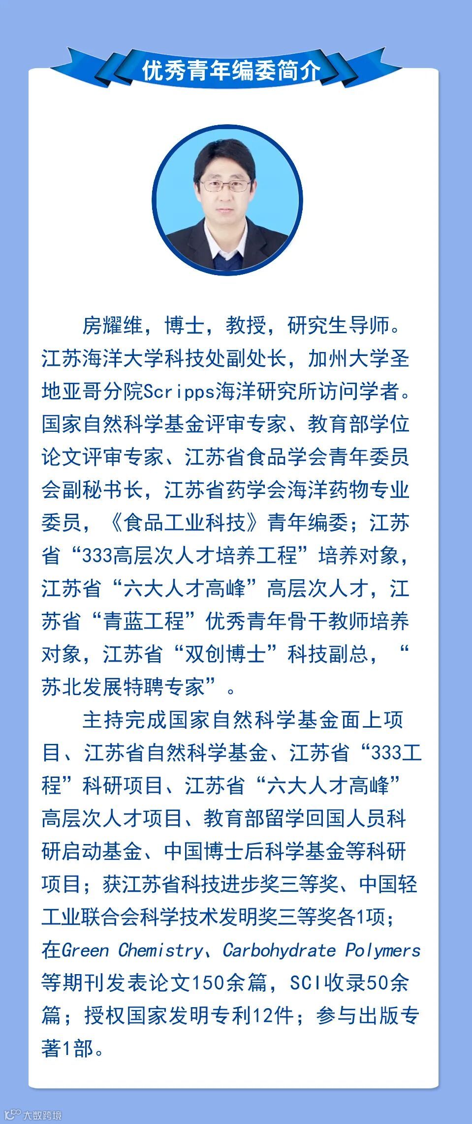 微生物生物技术研究团队是由房耀维教授组建,团队有教授1名,副教授3名,硕士研究生31名。实验室依托江苏海洋大学食品科学与工程学院科研平台,“海洋科学”省优势学科,农业(渔业发展和食品加工与安全)、生物与医药等专业硕士学位授权点,主要从事海洋微生物酶资源开发及应用和功能性益生菌资源发掘的相关研究。团队在Green Chemistry、Carbohydrate Polymers等期刊发表论文160余篇,SCI收录60余篇;获国家发明专利12件;主持国家自然科学基金面上项目等基金3项,江苏省自然科学基金面上项目等基金7项。