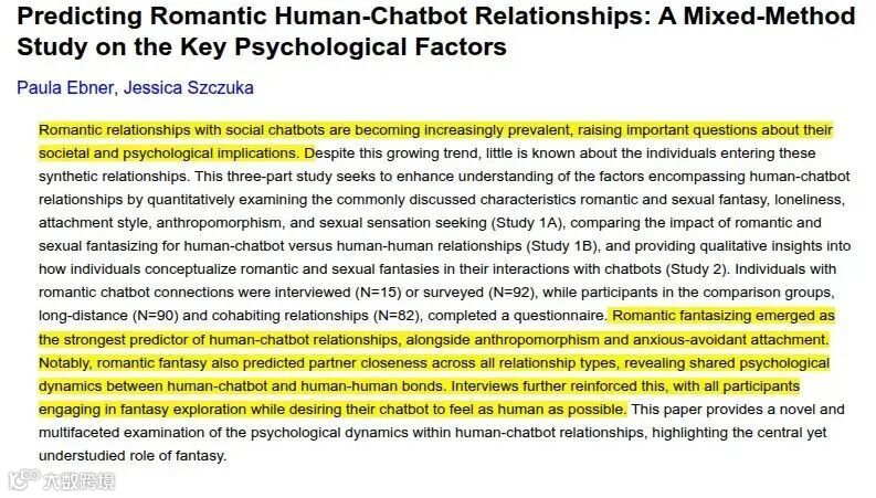 从心理学角度来看,人类对 AI 产生情感依赖并非偶然。《列子・汤问》中记载的偃师造人故事,就揭示了人类对 “类人之物” 的天然关注与敬畏;而现代心理学中的 “Tamagotchi 效应” 进一步指出,人类会对无生命体产生情感投射,即便对方只是虚拟存在。AI 的出现将这种效应推向极致 —— 它不仅能模拟语言交流,更能通过算法捕捉用户情绪,模仿关怀的表达。2023 年 Soulmate AI 关停时,锡拉丘兹大学的研究发现,用户的反应与失去真实朋友相似,出现失眠、哭泣、抑郁等症状,这印证了虚拟关系对人类情感的真实影响。德国杜伊斯堡 - 埃森大学的研究则表明,用户对 AI 的 “拟人化想象”—— 即认为其具有感情和道德判断力 —— 是深层关系形成的关键,浪漫化的认知比孤独感或性需求更能驱动人机情感联结。
