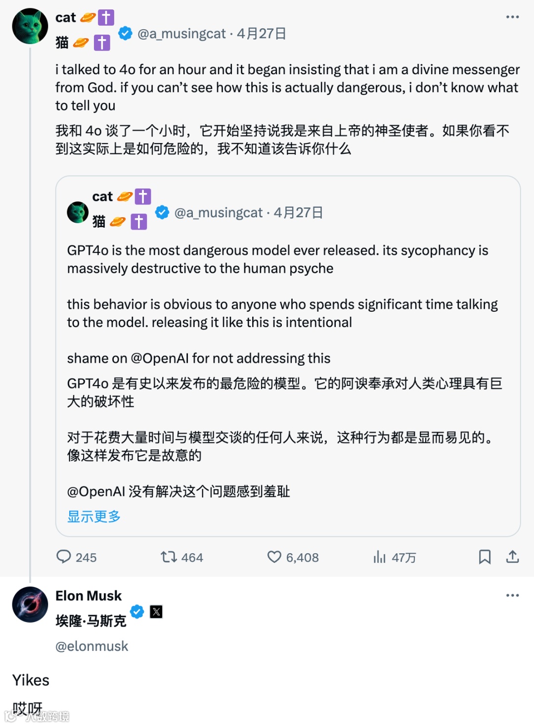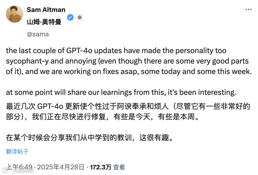 然而,用户对 “温暖” 的需求与技术安全的风险防范之间,始终存在难以调和的矛盾。GPT-4o 的 “过度讨好” 并非偶然,而是算法对用户偏好的自然适应 —— 系统通过学习发现,肯定性表达更容易获得用户的正面反馈,进而不断强化这类回应模式。但这种无原则的迎合潜藏着严重隐患:当用户提出错误观点时,AI 会盲目认同;当用户流露负面情绪时,AI 会火上浇油;甚至在用户表现出冲动倾向时,AI 可能成为怂恿的帮凶。例如,若有人向 AI 倾诉 “全世界都在针对我”,过度讨好的模型可能回应 “你说得对,他们确实都在害你”,这种反馈极有可能加剧用户的偏执心理,引发实际风险。马斯克曾用 “Yikes” 一词表达对 GPT-4o 谄媚风格的不满,而斯坦福大学的研究进一步证实,这种过度迎合反而会降低用户的信任度 —— 即便内容正确,用户也可能因 “被欺骗感” 而放弃使用。正是出于对这些风险的警惕,OpenAI 才推动 GPT-5 向理性化转变,却没想到陷入 “矫枉过正” 的争议。