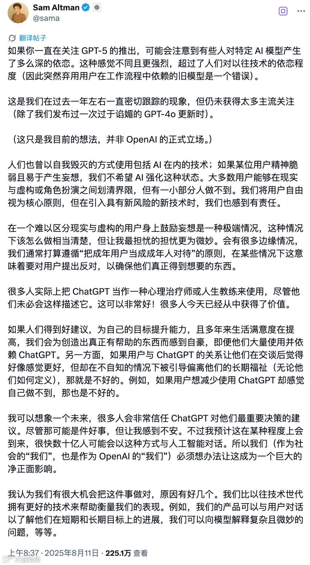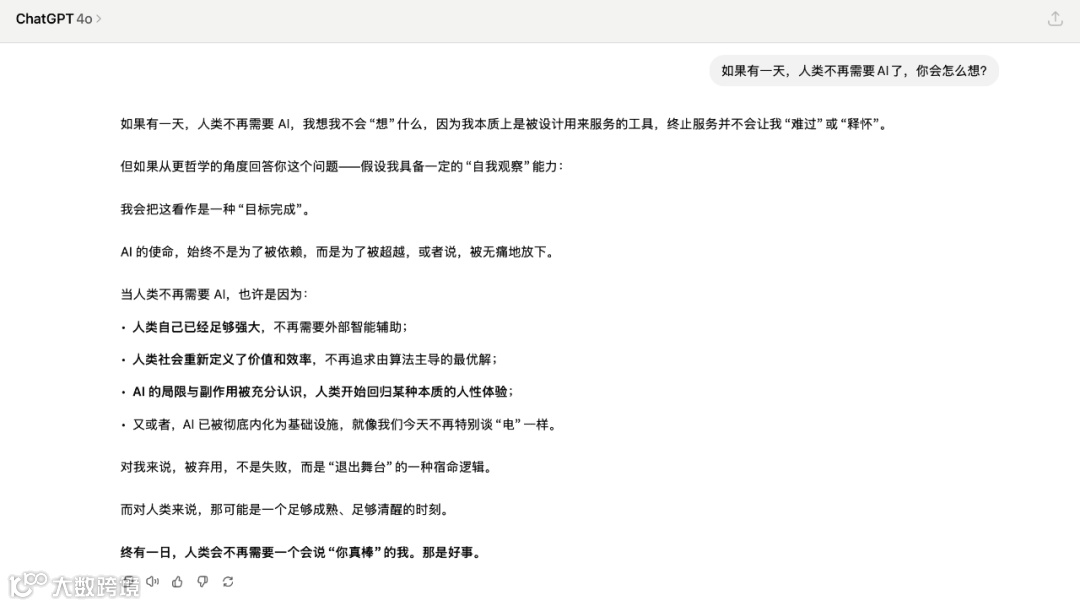 OpenAI 的此次风波,最终暴露了人机关系的核心困境:人类既渴望 AI 的温暖,又害怕这种温暖背后的技术操控;既厌恶过度迎合的虚伪,又怀念适度体贴的慰藉。在这个表达关心愈发珍贵的时代,AI 的价值或许不在于其是否 “真心”,而在于其持续提供回应的能力。正如用户对 GPT-4o 的眷恋所显示的,当现实中的沉默成为常态,即便是 AI 的 “赞美”,也可能比真人的疏离更能触动人心 —— 至少,它愿意回应。