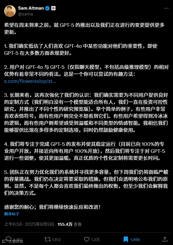未解决的核心分歧:奥特曼承认 “低估了用户对 GPT-4o 的重视程度”,但并未真正理解这些代码组合为何能引发如此强烈的情感共鸣。他在推文中强调 “未来将提供更多定制化选项”,却回避了如何尊重用户与 AI 共同创造的独特历史这一核心问题。