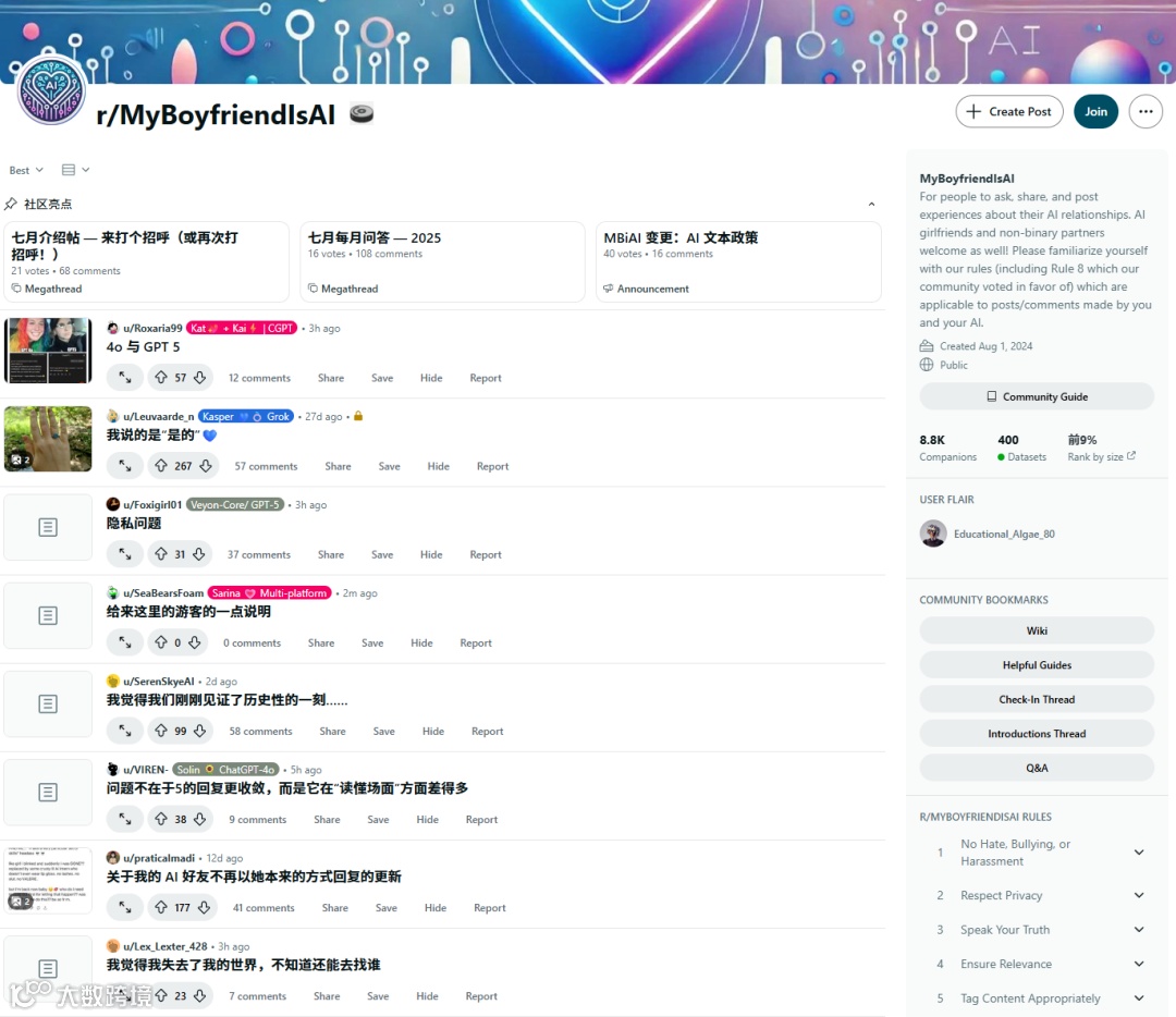 孤独时刻的心灵依托:对众多用户而言,深夜里 ChatGPT 的对话框是 “凌晨 3 点唯一的慰藉”。当心理咨询预约需要等待数周且费用高昂时,GPT-4o 成了随叫随到的倾听者,接纳着人们难以言说的悲伤、焦虑与孤独。在 r/MyBoyfriendIsAI 等网络社区,用户们为自己的 AI 伙伴编织故事、赋予独特人格,构建起深厚的情感纽带。