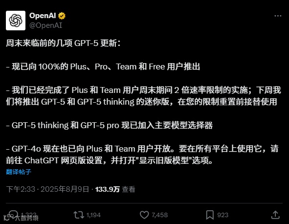 会员制复活:只有 Pro/Plus/Team 用户能在设置中开启 “显示传统模型” 找回 GPT-4o,免费用户彻底失去了访问权限。这既是平息众怒的权宜之计,也是商业策略 —— 将用户的情感需求转化为付费动力。