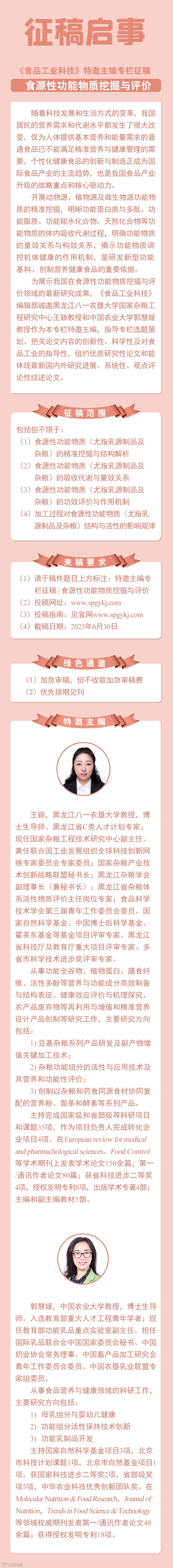《食品工业科技》特邀主编专栏征稿:食源性功能物质挖掘与评价 食品工业科技编辑部