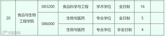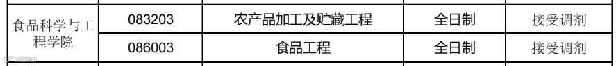 接受调剂专业:食品科学与工程097200/083200(097201/083201食品科学,097202/083202粮食、油脂及植物蛋白工程,097203/083203农产品加工及贮藏工程,097204/083204水产品加工及贮藏工程),生物与医药086000(086003食品工程)