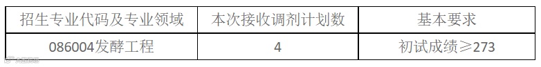 各位考生:根据我院第一志愿考生复试结果,本院现在开始接收非全日制086004发酵工程(专业学位)专业硕士研究生调剂申请,具体如下:
