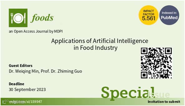 Foods期刊特邀中国科学院计算技术研究所闵巍庆副研究员及江苏大学郭志明教授共同创建特刊"Applications of Artificial Intelligence in Food Industry",旨在讨论人工智能在食品工业中的应用。特刊包括但不限于以下方面: