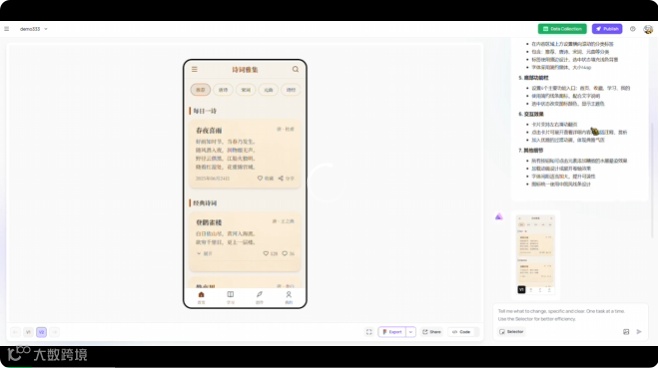 团队又尝试让 Readdy.ai 制作一个古诗词学习类软件。系统生成的结果不仅完成度高,而且整体审美氛围与古诗词学习场景高度贴合。字体选择了具有古典韵味的字体,色彩搭配上采用了淡雅的色调,营造出了一种宁静、优雅的学习氛围。在功能布局上,将诗词展示、注释解析、朗读播放等功能进行了合理安排,方便用户使用。间距等细节都处理得相当出色,几乎不需要再做过多调整,即可直接作为原型使用,甚至能够满足上线 MVP 版本的要求。这充分展示了 Readdy.ai 在不同应用场景下的强大适应性和设计能力。