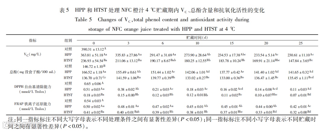 本文对比了超高压(Ultral high pressure processing,HPP,600 MPa,1 min)和高温短时(High temperature short time,HTST,110℃,8.6 s)杀菌处理对非浓缩还原(Not from concentrate,NFC)橙汁处理前后及4℃、25 d贮藏期内微生物、基本理化指标以及颜色、稳定性、生物活性成分、抗氧化活性等品质的影响,并在贮藏期末对杀菌橙汁进行了感官评价。结果表明,HPP和HTST处理后NFC橙汁菌落总数、霉菌和酵母菌、乳酸菌、嗜冷菌均降低至检测限以下(<10 CFU/mL),储藏25 d后HPP处理橙汁微生物仍未检出,符合国家果蔬汁饮料行业标准《NY/T 434-2016》,而HTST处理橙汁在贮藏期末菌落总数和霉菌酵母数量开始增加。HPP处理对橙汁色泽的L*、b*值无显著影响(P>0.05),使a*值显著增大(P<0.05),总色差ΔE低于HTST处理。HPP处理对橙汁悬浮稳定性的保持和果胶甲基酯酶(Pectin methylesterase,PME)的钝化效果较差,处理后HPP组和HTST组PME残留活性分别为92.31%和14.42%,贮藏末期分别为30.77%和0.03%,贮藏期间HPP组悬浮稳定性下降了95.45%。HPP处理显著提高了NFC橙汁的总酚含量13.50%(P<0.05),对维生素C含量、DPPH自由基清除能力、FRAP铁离子还原能力、综合感官评价无显著影响(P>0.05),显著高于HTST处理橙汁(P<0.05)。综上所述,HPP处理有助于保持橙汁的营养和感官品质,保留新鲜风味,比HTST处理更具优势,但对PME酶的钝化效果有待提高。