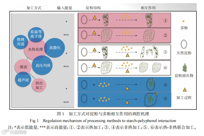 淀粉与多酚能够通过非共价键为主的作用力结合,形成具有不同理化性质、营养特性和生物利用率的淀粉-多酚复合物。本文从热、非热和联合处理角度出发,重点综述了近年来国内外利用不同食品加工方式调控淀粉与多酚相互作用的方法和效果,并对各类加工方式的调控机制进行了总结和比较。不同加工方式均通过对淀粉多尺度结构的改变来达到调控的效果。热加工以强烈的热效应影响淀粉的结构,更利于加强淀粉与多酚的接触和诱导新型结晶结构的生成。而非热加工对淀粉的结构影响普遍不及热加工,但能实现更为精细的加工效果。热-非热联合加工则能够进一步提高效率。通过对淀粉与多酚相互作用的调控现状进行分析,旨在为利用加工技术更好调控食品体系的品质提供参考。