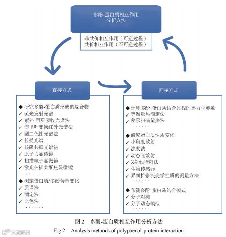 食品组分间的相互作用是食品科学研究领域的核心问题之一。本文按照直接和间接方式分类总结了多酚-蛋白质相互作用的分析方法,详细介绍了紫外-可见吸收光谱法、傅里叶变换红外光谱法、拉曼光谱、原子力显微镜、等温滴定量热法、分子对接、分子动态模拟等多种分析方法,并列举了这些技术在研究多酚-蛋白质相互作用中的特点和实例,以期为食品科学领域中多酚-蛋白质相互作用的相关研究工作提供参考,为食品其它组分间的相互作用提供借鉴。最后,本文探讨了多酚-蛋白质相互作用的研究思路与发展方向,探讨了开展此类相互作用研究的食品加工学意义。