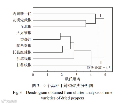 为分析朝天椒、线椒和角椒3种类型干椒品质差异,对9个特色品种干辣椒(内黄新一代、花溪党武椒和丘北椒三份朝天椒,大方皱椒、沙湾线椒、陕西秦椒和甘谷线椒四份线椒,托县红辣椒和益都红辣椒两份角椒)结构特征值(籽和肉含量)和9项品质指标(粗纤维、糖、脂肪、蛋白质、水分、灰分、类胡萝卜素、辣椒碱类物质和挥发性物质)进行了检测,并通过主成分分析和聚类分析进行干辣椒综合品质评价。结果表明:籽、肉干基占比分别为21%~47%和52%~79%,主要成分为粗纤维、糖、脂肪和蛋白质,含量分别为35%~46%、11%~28%、13%~19%和14%~18%。还原糖占总糖77%~99%;含19~27种脂肪酸,不饱和脂肪酸占总脂肪酸80%以上,其中亚油酸为61%~73%;类胡萝卜素含量为73~458 mg/100 g,以辣椒红素为主(37~221 mg/100 g);辣椒碱类物质含量18~206 mg/100 g;共检出11类挥发性物质,总含量1.12~7.65 mg/100 g。主成分分析将9项品质指标简化为3个主成分,累计方差贡献率为85.29%,反映了干辣椒品质绝大部分信息。9个品种干辣椒可聚为2类,3个品种的朝天椒为一类、4个品种线椒和2个品种角椒为一类。综合结构特征值及其与品质指标相关性分析发现:籽含量高的朝天椒脂肪、粗纤维和挥发性物质含量高,粗纤维、脂肪含量与籽含量显著正相关(P<0.05);角椒和线椒果肉含量高,总糖含量高,且总糖与果肉含量显著正相关(P<0.05)。朝天椒是制粉和火锅底料等的优质原料,角椒适宜作制酱原料,线椒类胡萝卜素含量高,可作增色调味和色素提取等的原料,本研究结果可为9个品种干辣椒品质评价及加工辣椒品种选择提供理论参考。