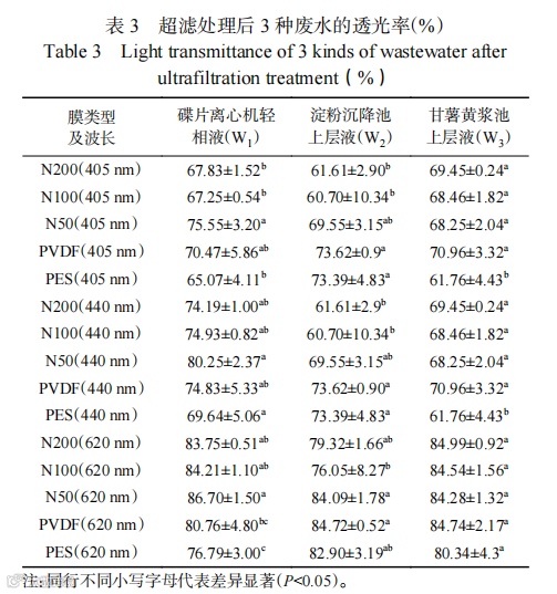 为了选择适宜的超滤膜对甘薯淀粉废水进行处理,以3种甘薯淀粉废水为研究对象,比较了无机陶瓷膜N50、N100和N200以及有机膜PVDF和PES的膜通量及其处理效果。结果表明:膜通量在超滤进行到第15~25 min时下降明显,之后基本保持稳定,其中陶瓷膜N200与N50具有较高的稳定膜通量,有机膜PVDF膜通量高于PES。废液经处理后,透光性显著加强,可溶性固形物去除率为39.8%~64.6%、可溶性蛋白质去除率为73.7%~99.0%、化学需氧量降低32.3%~73.2%,其中N50、PVDF和PES处理效果更好。综合膜通量及运行成本指导实际生产,实际生产中宜用N50或PVDF对甘薯淀粉废水进行超滤处理,以减轻后续处理压力,提高废水中有机物质的回收利用。