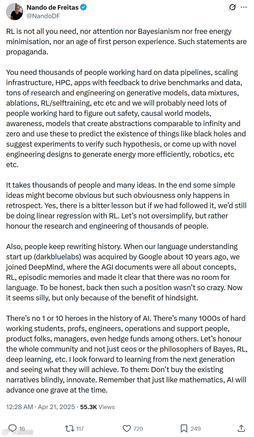 在人工智能的浪潮席卷全球的当下,技术的每一次突破都能引发公众的热烈讨论与无限遐想。近期,强化学习(RL)频繁出现在智能体和大模型等热门话题中,仿佛成为了 AI 领域的 “万能钥匙”。然而,微软副总裁 Nando de Freitas 的一番言论,犹如一剂清醒剂,打破了人们对单一技术的盲目追捧:“别再神化技术或个人,AI 是一场系统性工程。” 他明确指出,RL 固然重要,但远未达到 “RL is all you need” 的程度,这一观点引发了业界的广泛共鸣与深刻思考。