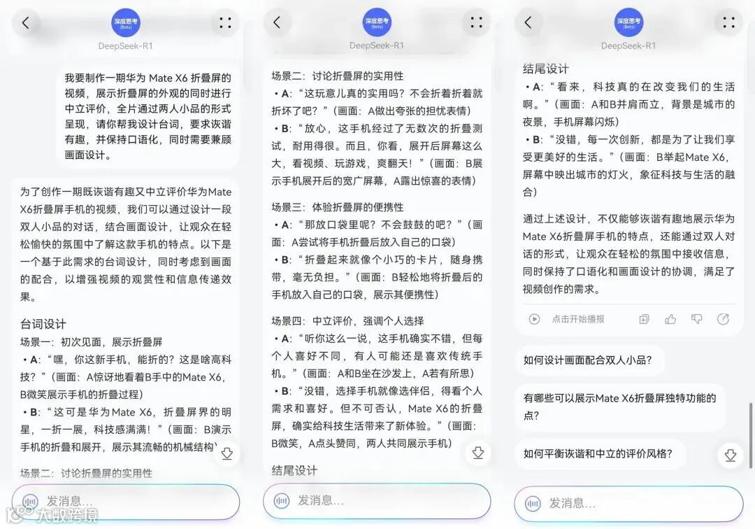 在中文写作测试中,针对制作华为 Mate X6 折叠屏视频台词并兼顾画面设计的复合型任务要求,小艺版 DeepSeek - R1 Beta 给出了一份结构完整、口语化较好的台词设计,每句对白搭配相应画面设计,但诙谐有趣程度不足。