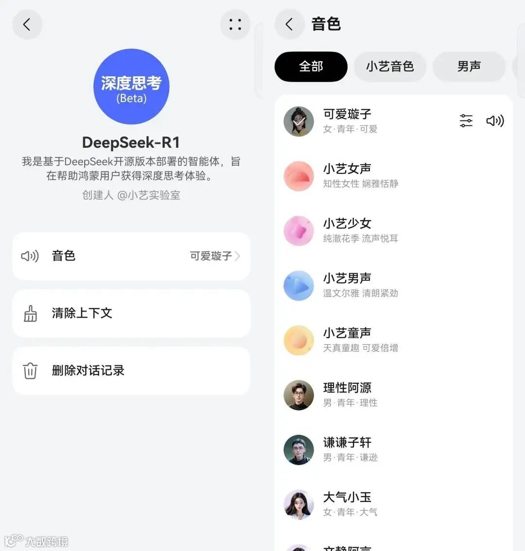 在将小艺助手升级到特定版本后,DeepSeek 正式现身小艺助手的智能体广场。从界面来看,华为小艺接入的 DeepSeek - R1 Beta 延续了小艺助手简洁直观的设计风格,分为上下两部分。上半部分有产品自我介绍及常见问题示例,方便初次使用者快速上手;下半部分为对话框,支持语音输入,语音内容能自动转化为文字即时发送,操作便捷。点击头像进入详情页面,能看到它基于 DeepSeek 开源版本部署,旨在为鸿蒙用户提供深度思考体验的介绍。不过,其设置相对简单,仅支持智能体音色、清除上下文和删除对话记录等基本操作,新开对话框功能暂未提供。