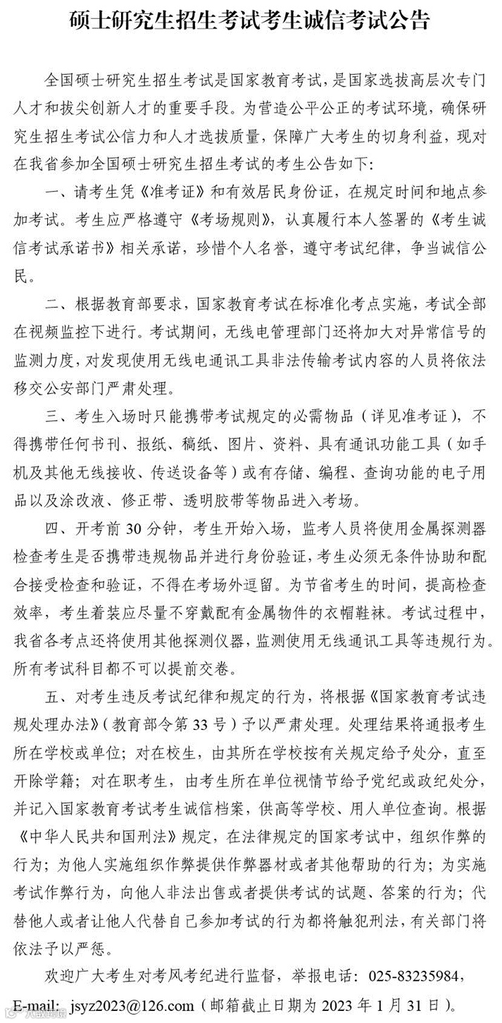 2.12月17日起,考生每日自行测量体温和监测健康状况,登录江苏省2023年研考考生健康申报系统(网址:https://yjs.jseea.cn),按系统提示填报相关信息;所有考生须于12月20日当天进行一次单管核酸检测采样,并于21日22:00前将核酸检测结果填写在健康申报系统,此结果将作为考场安排的参考依据。经研判如需调整考场,考点将在12月23日将调整结果告知考生,请考生保持通讯畅通。